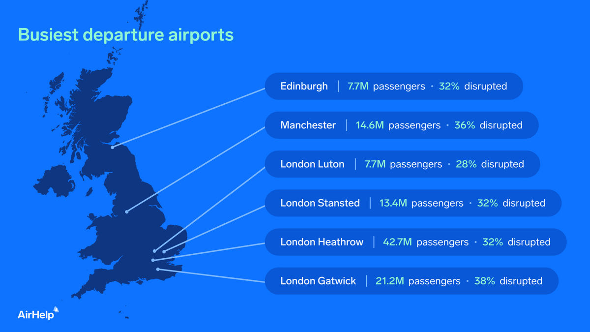 The busiest UK airport by far is Heathrow Airport in London, with 42.71 million passengers taking off in 2024 alone. Around 32% of them had a disruption to their flight.