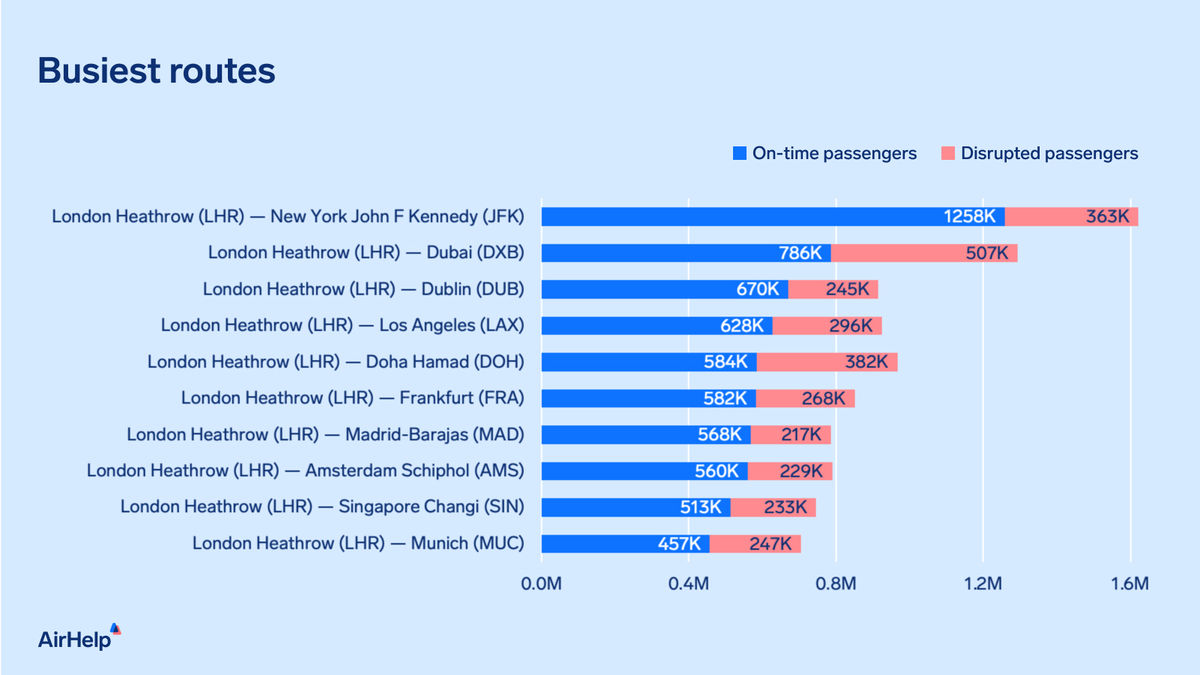 The most travelled route of all is to New York's John F. Kennedy International Airport. 1.6 million people took this route across the pond, 22% of them with a disruption.