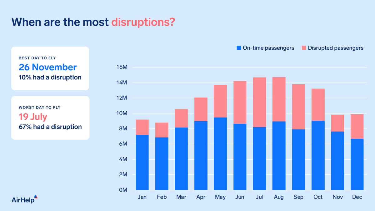 And July was unfortunately also the worst month to fly in terms of flight disruptions. 6.46 million passengers had a flight delay or cancellation — which is 44% of all passengers that month!