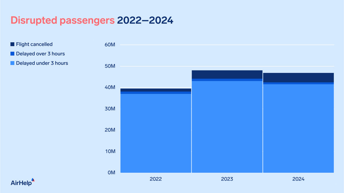While flight disruptions are high, with 32% of passengers experiencing a delay or cancellation in 2024, it could be worse. In 2022 it was 36% of passengers!