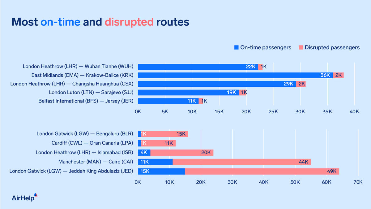 If you want to practically guarantee you arrive on time, try flying from London Heathrow to Wuhan Airport in China. Just 3% of passengers had a flight disruption. But it is also a smaller route, with just 23,000 travellers in 2024.